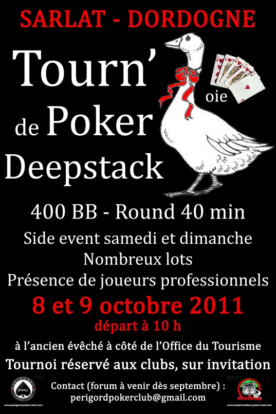 Le Périgord Poker Club et le Sarlat Holdem Poker Club (24) sont heureux de vous annoncer leur premier évènement majeur organisé en commun les 8 et 9 octobre prochain. LE TOURN’OIE